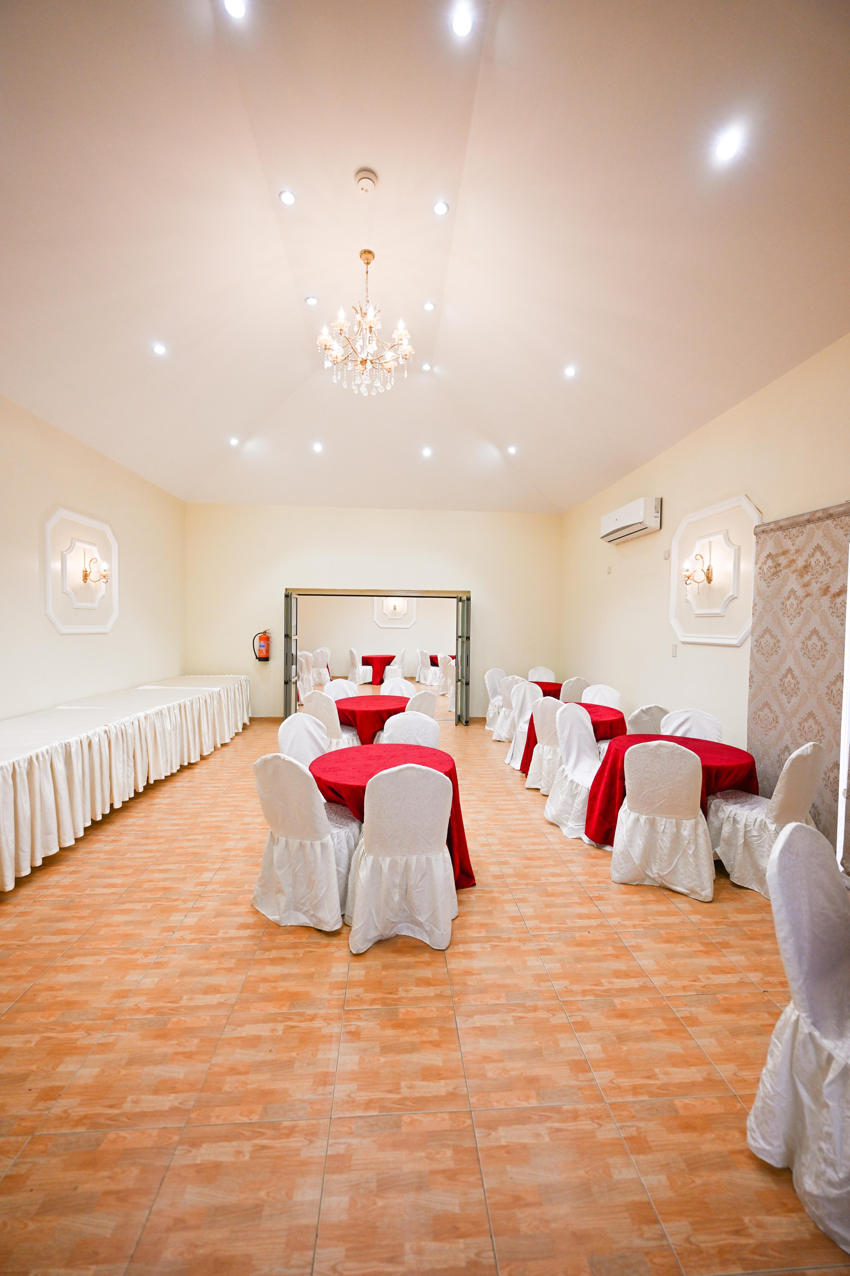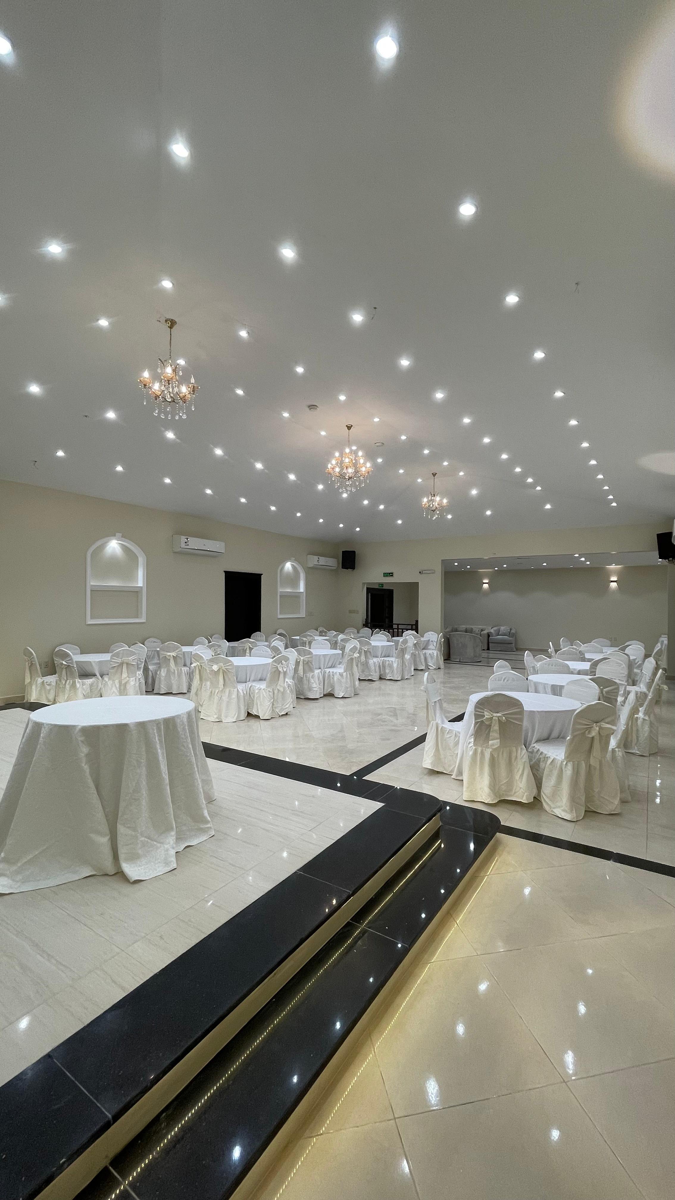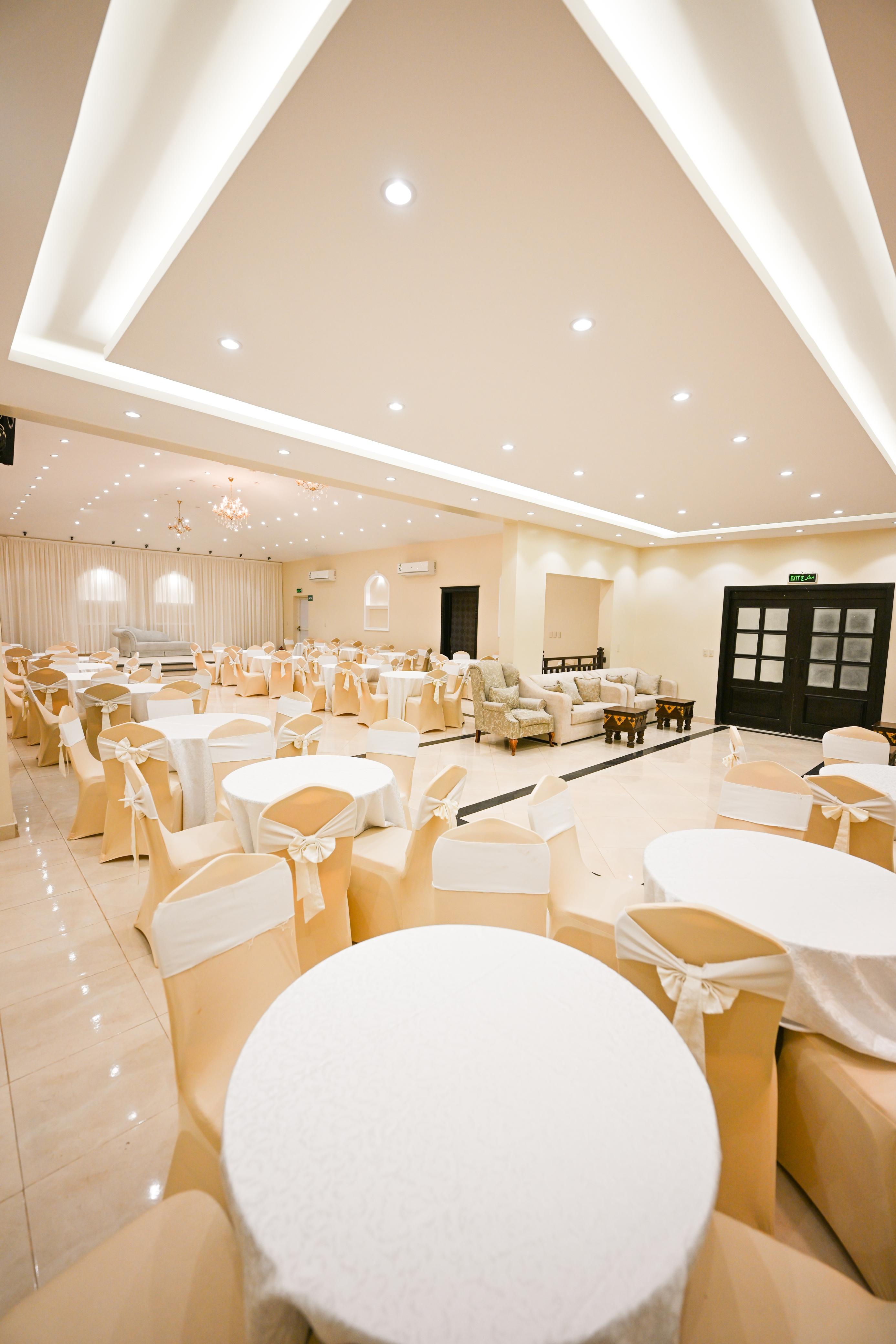 صالة النساء وفيها 20 طاولة على كل طاولة 5 كراسي تتسع لـ 100 شخص وطقم كنب لإستقبال ضيوف المناسبة.