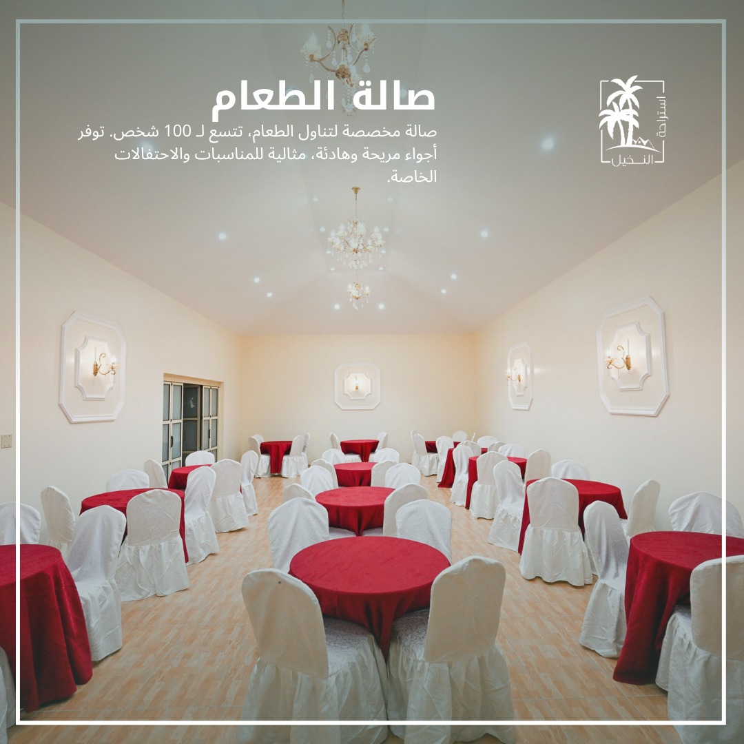 صالة الطعام وفيها 20 طاولة على كل طاولة 5 كراسي تتسع لـ 100 شخص.